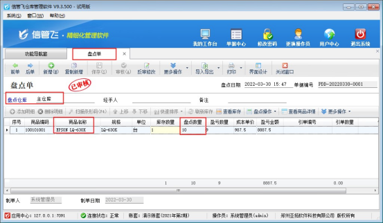 假如實際盤點商品“EPSON LQ-630K”庫存數量為10臺,和軟件中查詢到的庫存數量不一致,需要在軟件中開一個盤點單進行更正庫存數量,在“倉庫管理”中打開“盤點單”,選擇倉庫“主倉庫”,然后選擇商品“EPSON LQ-630K”,輸入盤點數量“10”,然后保存審核盤點單,然后再次查詢庫存,可看到庫存數量已更正為10。如下圖所示: