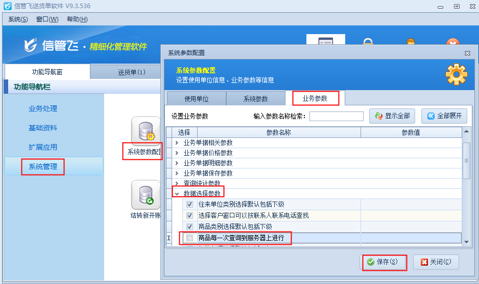 經(jīng)檢查發(fā)現(xiàn),原因是啟用了參數(shù)影響,解決辦法如下,在功能導(dǎo)航窗點(diǎn)擊“系統(tǒng)管理”—“系統(tǒng)參數(shù)配置”,在“業(yè)務(wù)參數(shù)”的選擇參數(shù)中取消勾選參數(shù)“商品每一次查詢到服務(wù)器上進(jìn)行”,然后保存設(shè)置,如下圖所示: