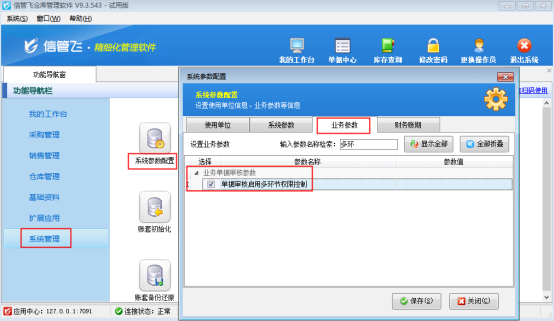 軟件多級審核最多支持5級審核,支持設置各類單據。本文以“銷售出庫單”為例示范。首先需啟用參數,在功能導航窗點“系統管理”→“系統參數配置”→“業務參數”,勾選“單據審核啟用多環節權限控制”,點擊“保存”按鈕,如下圖所示: