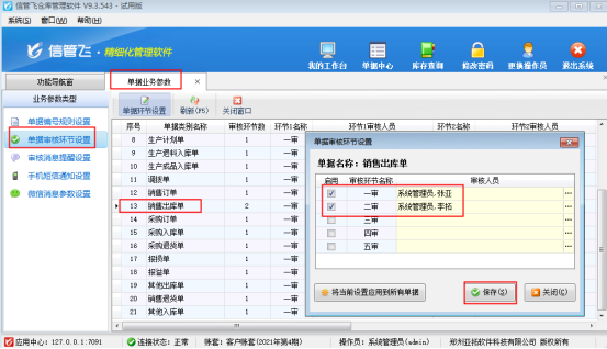 系統參數設置完成后,在“系統管理”→“單據業務參數”中選擇左側工具欄的“單據審核環節設置”,選擇“銷售出庫單”,點擊“單據環節設置”,啟用“一審”和“二審”并設置對應審核環節的審核人員“張亞”和“李拓”,然后保存設置,如下圖所示: