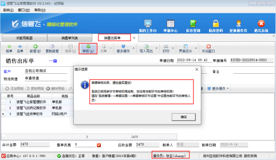 “一審”操作員“張亞”登錄軟件,新開銷售出庫單,保存并審核單據,審核狀態顯示“一審”,操作員“張亞”沒有二審權限,再次點擊“審核”會提示“系統已啟用多環節審核權限控制,您沒有當前環節的審核權限!”如下圖所示: