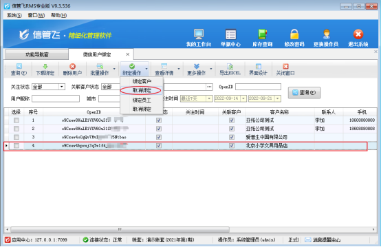 若是綁定有誤或者更換綁定客戶或業(yè)務(wù)員可進(jìn)行解除綁定再重新綁定。如何取消綁定?本文以信管飛RMS軟件為例示范如下: