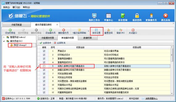 在功能導航窗點擊“系統管理”—》“操作員及授權”,進入“操作員管理及授權”界面,選擇操作員賬號,然后在“其他操作權限”界面將“采購入庫單價可高于最高進價”權限勾選取消,然后保存權限設置,如下圖所示,設置操作員“張亞”采購入庫單價不可高于最高進價。
