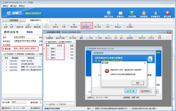 參數設置好之后,新增業務單據時如添加了附件資料,系統可直接將附件資料文件名存儲到此單據的“單據主體.擴展信息1”數據項內,如下圖所示,銷售出庫單添加了“附件1、附件2、附件3、附件4”4個附件,附件文件名可直接存儲在“單據主體.擴展信息1”內方便查看(“擴展信息1”數據項如不顯示,可通過界面設計配置顯示出來)。
