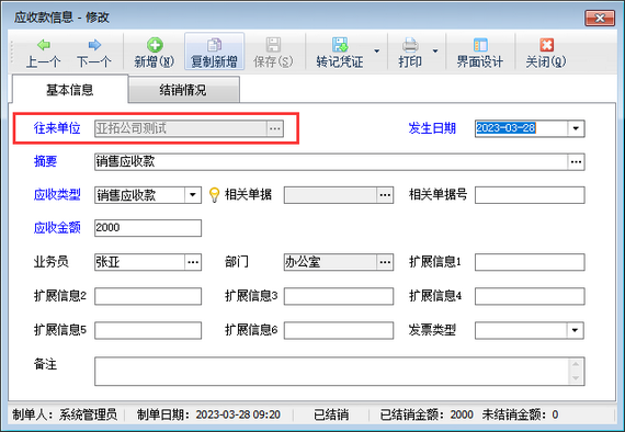 如修改應收款信息時無法修改往來單位名稱,原因是此應收款信息已存在結銷記錄,如需修改應收款往來單位名稱,需紅沖(刪除)已存在的結銷記錄,然后即可修改應收款信息的往來單位名稱。