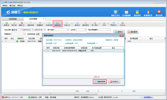 在應收款管理界面選擇需要修改的應收款記錄,工具欄點擊“查看結銷”—》“查看結算單”,打開收款結算單界面,如下圖所示。