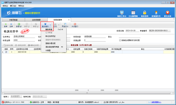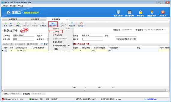 然后在收款結算單界面點擊“更多操作”—》“紅沖單據”,如下圖所示,單據紅沖后,點擊“更多操作”—》“刪除按鈕”,即可刪除收款結算單。