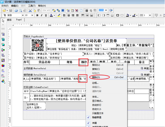 如何在打印模板上刪除顏色數(shù)據(jù)列?打印模板格式因?yàn)槌叽绻潭ǎ枰獎(jiǎng)h除明細(xì)列,刪除后增加其他文本框的寬度。在開單界面打印下選擇打印格式設(shè)計(jì),打印格式設(shè)計(jì)界面點(diǎn)擊“設(shè)計(jì)格式”,進(jìn)入模板設(shè)計(jì)器界面,選擇需要?jiǎng)h除的文本框,鼠標(biāo)左鍵單擊選擇文本框(需要多選可按著shift鍵鼠標(biāo)分別單擊,可同時(shí)刪除兩個(gè)文本框),下一步鼠標(biāo)右鍵,刪除,如圖所示: