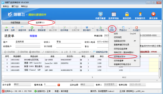 功能導(dǎo)航窗點(diǎn)擊“業(yè)務(wù)處理”—》“新開送貨單”,新增并保存一張送貨單單據(jù),工具欄“打印”下點(diǎn)擊“打印格式設(shè)計(jì)”,在打印格式設(shè)計(jì)界面選擇模板點(diǎn)擊“設(shè)計(jì)格式”進(jìn)入打印模板設(shè)計(jì)器界面,示例模板:送貨單打印模版(B02),如下圖所示: