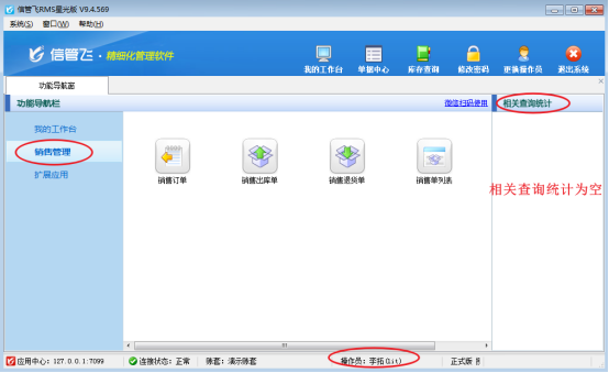 以操作員“李拓”為例,未設(shè)置操作員銷售管理相關(guān)查詢權(quán)限時,操作員賬號登錄,銷售管理右側(cè)相關(guān)查詢?yōu)榭瞻祝疚囊?A title="" >信管飛RMS軟件為例演示一下操作員賬號無法查看銷售管理相關(guān)查詢,如何解決?如圖所示: