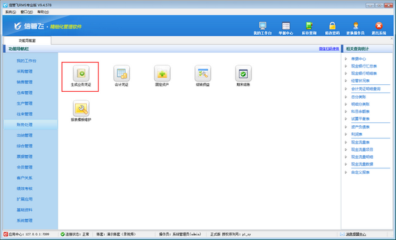 信管飛RMS專業版包含財務處理功能,可登記會計憑證,支持直接對已開單據進行快速生成會計憑證操作,如下圖所示。為避免操作員誤生成會計憑證,軟件支持設置操作員權限,本篇文章介紹下如何設置操作員不可使用生成業務憑證功能?