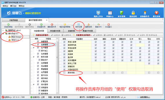 登錄軟件,在功能導(dǎo)航窗點擊“系統(tǒng)管理”—》“操作員及授權(quán)”,進入“操作員管理及授權(quán)”界面,選擇操作員“張亞”,在其右側(cè)的功能模塊權(quán)限內(nèi)選擇“倉庫管理”,將庫存月結(jié)的“使用”權(quán)限勾選取消,然后保存設(shè)置,如下圖所示。