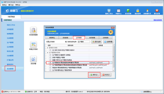 在功能導(dǎo)航窗點擊“系統(tǒng)管理”—》“系統(tǒng)參數(shù)配置”—》“業(yè)務(wù)參數(shù)”打開業(yè)務(wù)參數(shù)配置界面,然后在生產(chǎn)管理相關(guān)參數(shù)中打鉤啟用“生產(chǎn)模板的擴展信息提取到單據(jù)的擴展信息”參數(shù),參數(shù)值輸入相應(yīng)提取的擴展信息編號,如提取擴展信息1和擴展信息2,則需要輸入“ext1=ext1,ext2=ext2”,用英文的逗號間隔,然后點擊“保存”按鈕保存參數(shù)配置,如下圖所示。