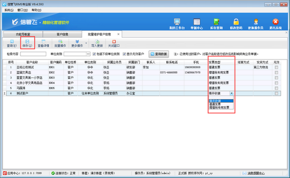 進入到批量維護客戶信息界面后,依次設(shè)置每個客戶的默認(rèn)發(fā)票類型,然后在工具欄點擊“保存”按鈕保存設(shè)置即可,如下圖所示: