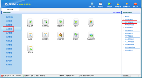 參數(shù)設(shè)置完成后,退出重新登錄軟件,此時(shí)倉(cāng)庫(kù)管理右側(cè)查詢統(tǒng)計(jì)處已顯示庫(kù)存分倉(cāng)明細(xì)查詢。