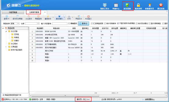 操作員權(quán)限設(shè)置完成后,使用操作員“張三”登錄軟件,點(diǎn)擊右上方庫(kù)存查詢,此時(shí)即可正常查詢庫(kù)存,如下圖所示。