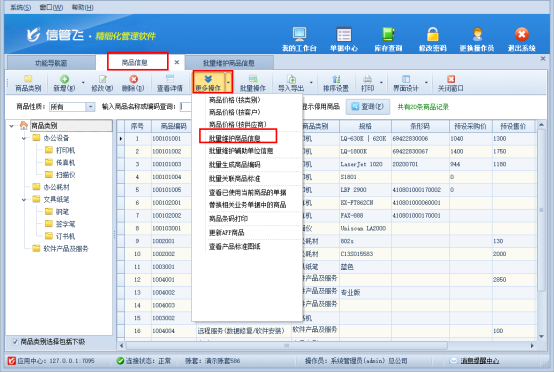 二、信管飛軟件的批量維護(hù)商品價(jià)格功能信管飛軟件作為一款專業(yè)的企業(yè)管理軟件,憑借其強(qiáng)大的功能和靈活的操作性,在市場中贏得了良好的口碑。其中,批量維護(hù)商品價(jià)格功能更是其一大亮點(diǎn)。在商品信息更多操作下點(diǎn)擊“批量維護(hù)商品信息”可進(jìn)行批量修改操作,如下圖所示: