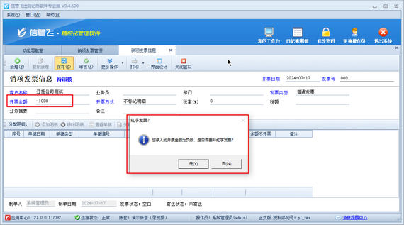錄入開票日期、發(fā)票號、客戶名稱及開票金額等其他信息,如錄入紅字發(fā)票,開票金額請錄入負(fù)數(shù),如下圖所示。開票金額錄入負(fù)數(shù),保存發(fā)票時,系統(tǒng)會彈出提示信息“您錄入的開票金額為負(fù)數(shù),是否需要開紅字發(fā)票?”在彈出的提示信息窗口,點(diǎn)擊“是”確認(rèn)填開紅字發(fā)票即可。