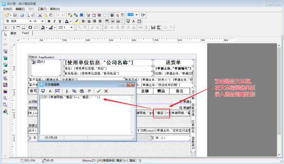 打印模板預(yù)覽界面中默認(rèn)是沒有此項(xiàng),需要在模板中進(jìn)行添加此項(xiàng),贈(zèng)品調(diào)用數(shù)據(jù)項(xiàng):[IIF([單據(jù)明細(xì)."贈(zèng)品"]=1,'贈(zèng)品',' ')] ,如下圖所示: