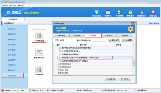 在功能導(dǎo)航窗點(diǎn)擊“系統(tǒng)管理”—》“系統(tǒng)參數(shù)配置”,勾選啟用“業(yè)務(wù)參數(shù)”中的“商品規(guī)格可以輸入”|“分成多種規(guī)格,開單可以選擇”參數(shù)。如下圖所示: