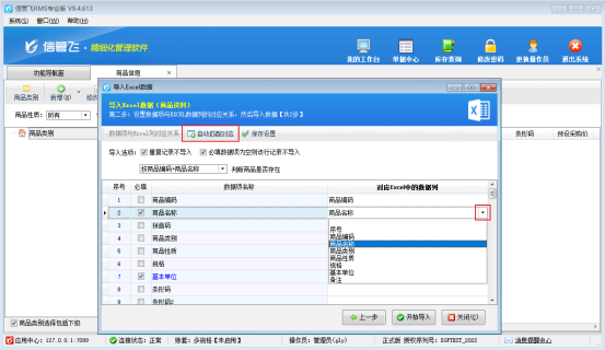 選擇商品Excel文件后,導(dǎo)入界面點(diǎn)擊下一步,設(shè)置數(shù)據(jù)項(xiàng)與Excel數(shù)據(jù)列的對應(yīng)關(guān)系,點(diǎn)“自動對應(yīng)”軟件會自動根據(jù)數(shù)據(jù)項(xiàng)名稱和數(shù)據(jù)列列名是否相同進(jìn)行自動匹配。也可以按照下圖所示手工選擇對應(yīng)關(guān)系。