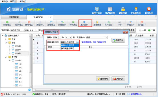 檢查憑證號斷號功能允許用戶定期對日記賬中的憑證號進行檢查,一旦發現斷號情況,可根據預設的規則進行自動調整,確保憑證號的連續性和準確性。支持以下兩種編號規則:前移補齊憑證號、按日期重新編號,本文章示范按日期重新編號規則,在日記賬列表更多操作下點擊“檢查憑證號斷號”彈出檢查界面,如下圖所示: