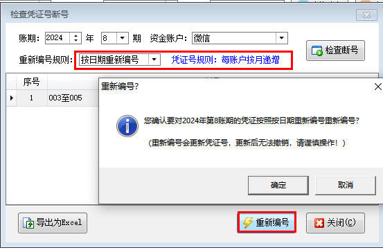 選擇賬期、資金賬戶、重新編號規則后,點擊“重新編號”按鈕,會按編號規則重新生成,如下圖所示:
