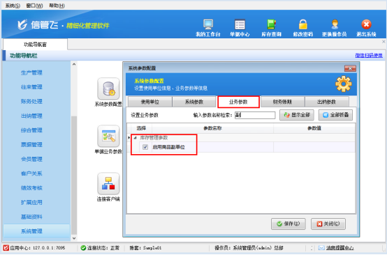 在功能導航窗中點擊“系統管理”—“系統參數配置”,進入“系統參數配置”界面。然后,點擊“業務參數”,在庫存管理參數內找到“啟用商品副單位”參數,并勾選此參數保存。啟用后,在商品信息中可以維護副單位信息。