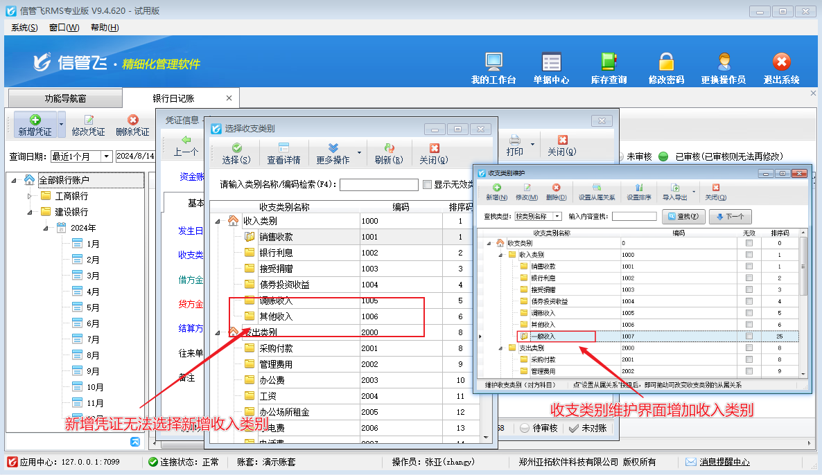 信管飛RMS標(biāo)準(zhǔn)版和專業(yè)版支持出納模塊,可登記現(xiàn)金和銀行日記賬,日記賬登記時需要選擇收支類別,支持新增收支類別。操作員新增收支類別后在新增憑證無法選擇新增的收支類別,該如何解決?