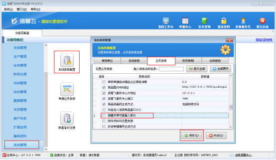 在功能導航窗點擊“系統(tǒng)管理”—》“系統(tǒng)參數(shù)設置”—》“業(yè)務參數(shù)”打開業(yè)務參數(shù)配置界面,如下圖所示,在特殊功能參數(shù)中找到“銷售開單可查看入庫價”參數(shù),取消勾選此參數(shù),然后點擊“保存”按鈕保存參數(shù)配置。