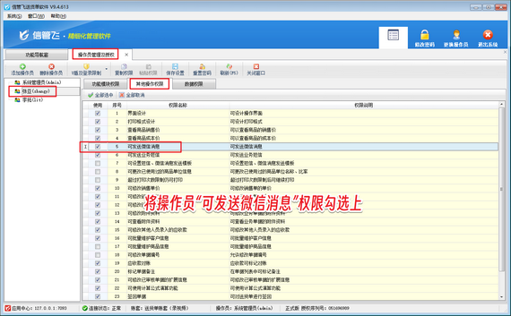出現(xiàn)以上問(wèn)題的原因是:當(dāng)前登錄的操作員賬號(hào)沒(méi)有可發(fā)送微信消息的權(quán)限。