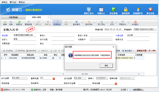 信管飛RMS軟件是集進(jìn)銷存和應(yīng)收應(yīng)付款管理一體的軟件,有客戶咨詢需要反審修改單據(jù)的單價(jià)時(shí)修改不了,如何解決,提示如下圖所示: