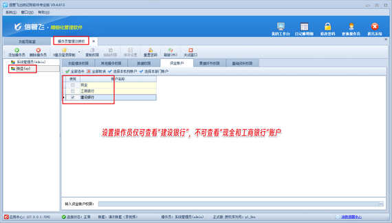 系統(tǒng)管理員可為每位操作員細(xì)致分配權(quán)限。例如,為操作員“張亞”設(shè)置權(quán)限時,可明確排除其查看“現(xiàn)金和工商銀行”賬戶的權(quán)限,確保信息的隔離與安全。