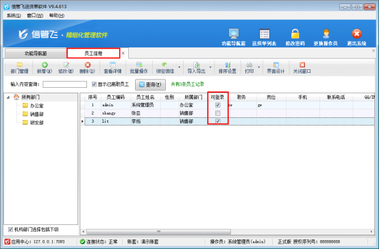 信管飛軟件支持設置多個可登錄操作員,可不同人員登錄軟件進行操作開單。在員工信息界面,可登錄員工對應的可登錄狀態(tài)顯示勾選,如下圖所示: