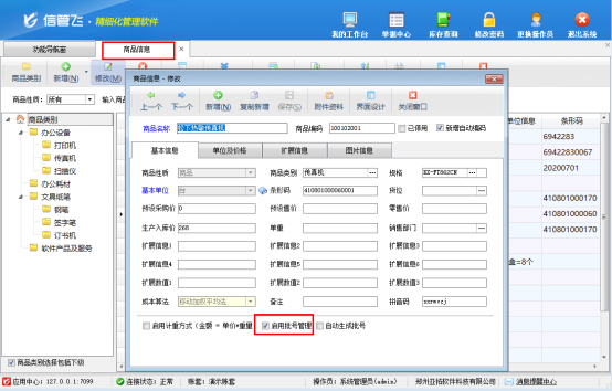 在信管飛RMS軟件中,啟用批號管理功能極為簡便。用戶只需在基礎(chǔ)資料商品信息中勾選“啟用批號管理”選項,即可開啟這一強大功能。這一設(shè)置不僅為后續(xù)的批號管理打下了堅實的基礎(chǔ),也讓企業(yè)的庫存管理邁出了智能化的第一步。