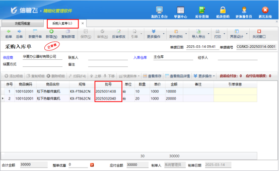 當(dāng)企業(yè)采購商品時,信管飛RMS軟件的批號管理功能能夠充分發(fā)揮其作用。在采購入庫單中,用戶只需錄入不同批號的商品及其對應(yīng)數(shù)量,系統(tǒng)即可自動記錄并管理這些批次的商品信息。這樣一來,企業(yè)就能輕松掌握每一批次商品的來源與數(shù)量,為后續(xù)的銷售與庫存管理提供有力支持。