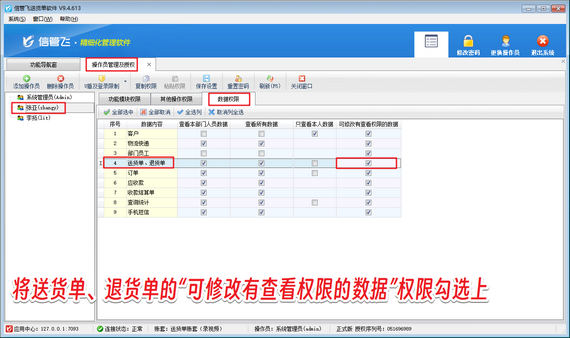 解決方法如下:使用系統(tǒng)管理員賬號(hào)登錄軟件,在功能導(dǎo)航窗點(diǎn)擊“系統(tǒng)管理”—》“操作員及授權(quán)”打開操作員管理及授權(quán)界面,選擇操作員賬號(hào),在“數(shù)據(jù)權(quán)限”界面將送貨單、退貨單的“可修改有查看權(quán)限的數(shù)據(jù)”的權(quán)限勾選上,然后保存權(quán)限設(shè)置,如下圖所示。