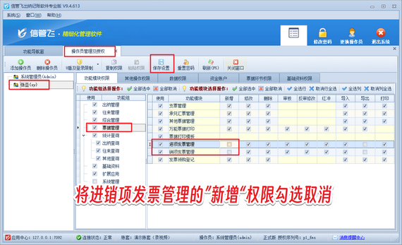 系統(tǒng)管理員賬號(hào)登錄軟件,在功能導(dǎo)航窗點(diǎn)擊“系統(tǒng)管理”—》“操作員及授權(quán)”,進(jìn)入“操作員管理及授權(quán)”界面,選擇操作員賬號(hào)“張亞”,在其右側(cè)的功能模塊權(quán)限內(nèi)選擇“票據(jù)管理”模塊,將進(jìn)/銷(xiāo)項(xiàng)發(fā)票管理的“新增”權(quán)限勾選取消,然后保存權(quán)限設(shè)置,如下圖所示。