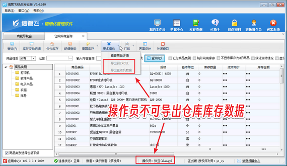 信管飛RMS支持倉庫庫存查詢功能,倉庫庫存查詢可以查看存貨的實時庫存情況,包括庫存數(shù)量、庫存成本情況等,同時支持導(dǎo)出倉庫庫存數(shù)據(jù)。若操作員賬號登錄軟件無法導(dǎo)出倉庫庫存數(shù)據(jù),通常源于操作員權(quán)限未啟用,本篇文章為您呈現(xiàn)高效解決方案。