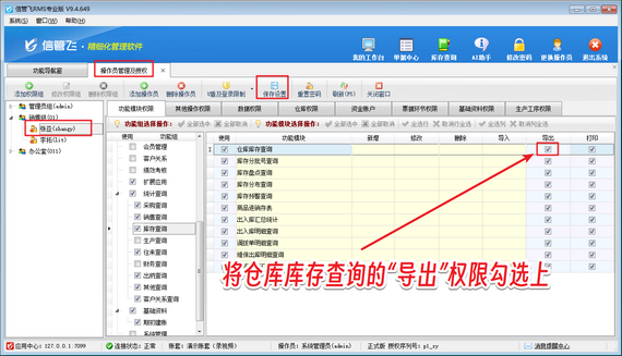 在功能導(dǎo)航窗點擊“系統(tǒng)管理”—》“操作員及授權(quán)”打開操作員管理及授權(quán)界面,選擇操作員賬號“張亞”,然后在其右側(cè)的功能模塊權(quán)限內(nèi)選擇“庫存查詢”,將倉庫庫存查詢的“導(dǎo)出”權(quán)限勾選上,然后保存權(quán)限設(shè)置,如下圖所示。