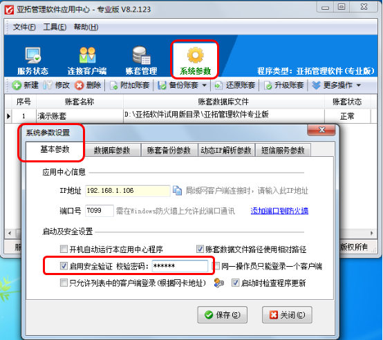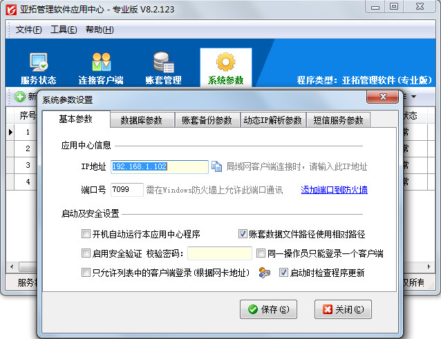 系統參數設置主要包括基本參數、數據庫參數、賬套備份參數、動態IP解析參數、短信服務參數等,亞拓管理軟件、亞拓倉庫管理軟件的應用中心都包含系統參數設置功能,下面我們以亞拓管理軟件為例來介紹一下系統參數設置的相應功能。 打開亞拓管理軟件應用中心(桌面右下角紅色的圖標)—》“系統參數”即可進入系統參數設置界面,如下圖1所示:圖11