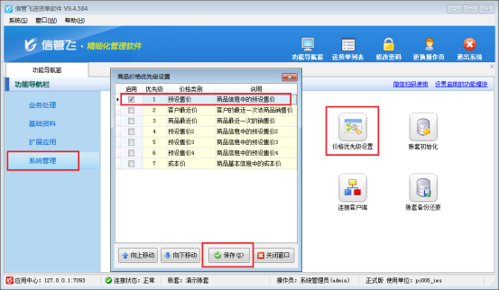 信管飛軟件支持維護客戶銷售價格,可以對不同客戶的商品價格進行集中管理。并且支持設置銷售價格的優先級,比如:客戶最近價、預設售價等。有部分用戶使用時修改了商品價格開單時選擇商品沒有獲取修改后的最新價格,該如何解決? 出現此問題原因:系統管理界面價格優先級,第1級價格設置的是客戶最近價;用戶修改的是商品信