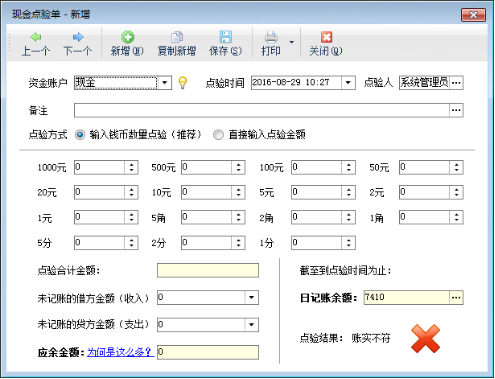 亞拓管理軟件標準版和專業版、紅管家出納記賬軟件標準版和專業版都包括出納管理功能,出納管理主要包含現金日記賬、銀行日記賬、現金點驗單、銀行對賬單、銀行對賬和出納期末結賬等功能。下面我們以亞拓管理軟件專業版為例講一下出納模塊中現金點驗單的使用方法。 在功能導航窗,點擊“出納管理”—》“現金點驗單”,即可進入“現金點驗單”界面,如