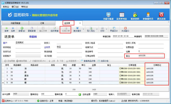 紅管家送貨單軟件、亞拓管理軟件都支持先開訂單,然后送貨單和采購銷售出庫單可以引用訂單的內(nèi)容。有時候需要引用訂單的附記內(nèi)容,可以在送貨單等單據(jù)引用訂單的時候可在送貨單界面的單據(jù)明細(xì)顯示引單附記內(nèi)容。 以送貨單軟件為例,如何引用訂單顯示引單附記?軟件默認(rèn)引單附記調(diào)用的是訂單的備注內(nèi)容。先開一個訂單,訂單的