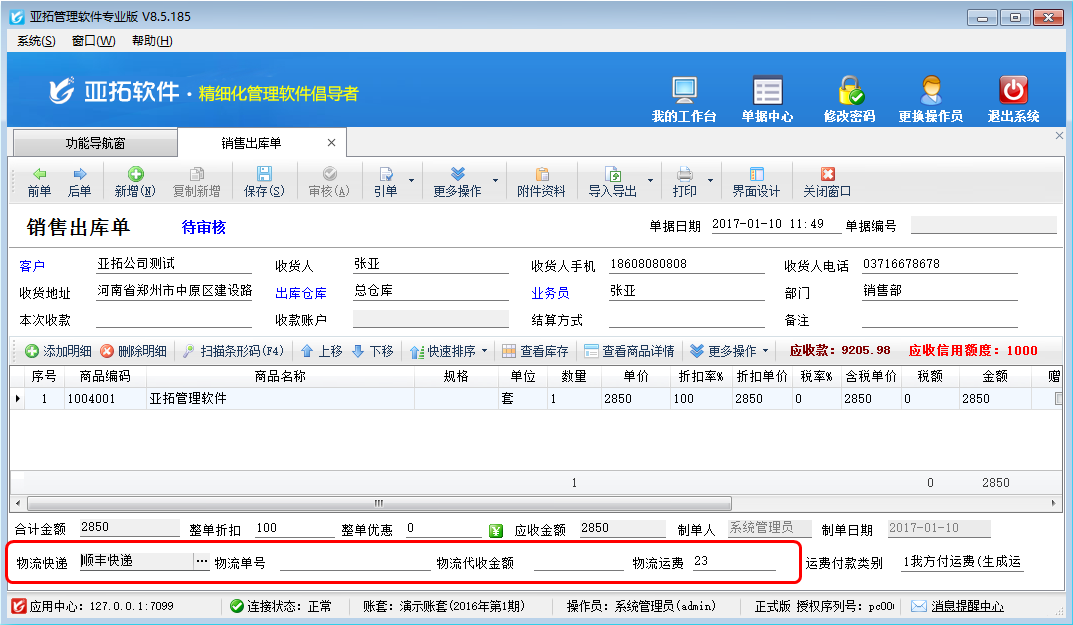亞拓管理軟件標(biāo)準(zhǔn)版及專業(yè)版內(nèi)都可以設(shè)置提取物流快遞數(shù)值(如運(yùn)費(fèi))至單據(jù)指定的數(shù)據(jù)項內(nèi),本篇文章以亞拓管理軟件專業(yè)版為例介紹一下如何提取物流快遞運(yùn)費(fèi)至單據(jù)指定數(shù)據(jù)項內(nèi)?一、維護(hù)物流快遞運(yùn)費(fèi) 在功能導(dǎo)航窗點(diǎn)擊“基礎(chǔ)資料”—》“物流快遞”打開物流快遞信息界面,修改“順豐快遞”運(yùn)費(fèi)為23元(可將物流快遞運(yùn)費(fèi)維護(hù)在“擴(kuò)展數(shù)值(數(shù)據(jù)項英